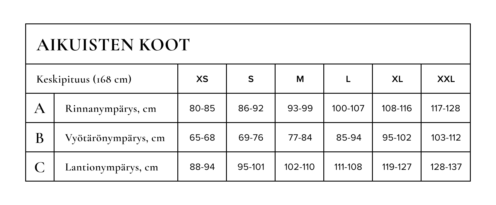 Täältä löydät yleiset mittataulukot vaatteille. Tuotekohtaiset mittataulukot löytyvät tuotekorteilta tuotekuvissa.