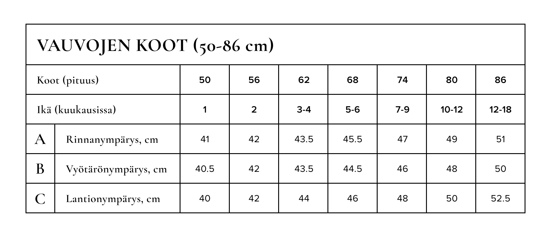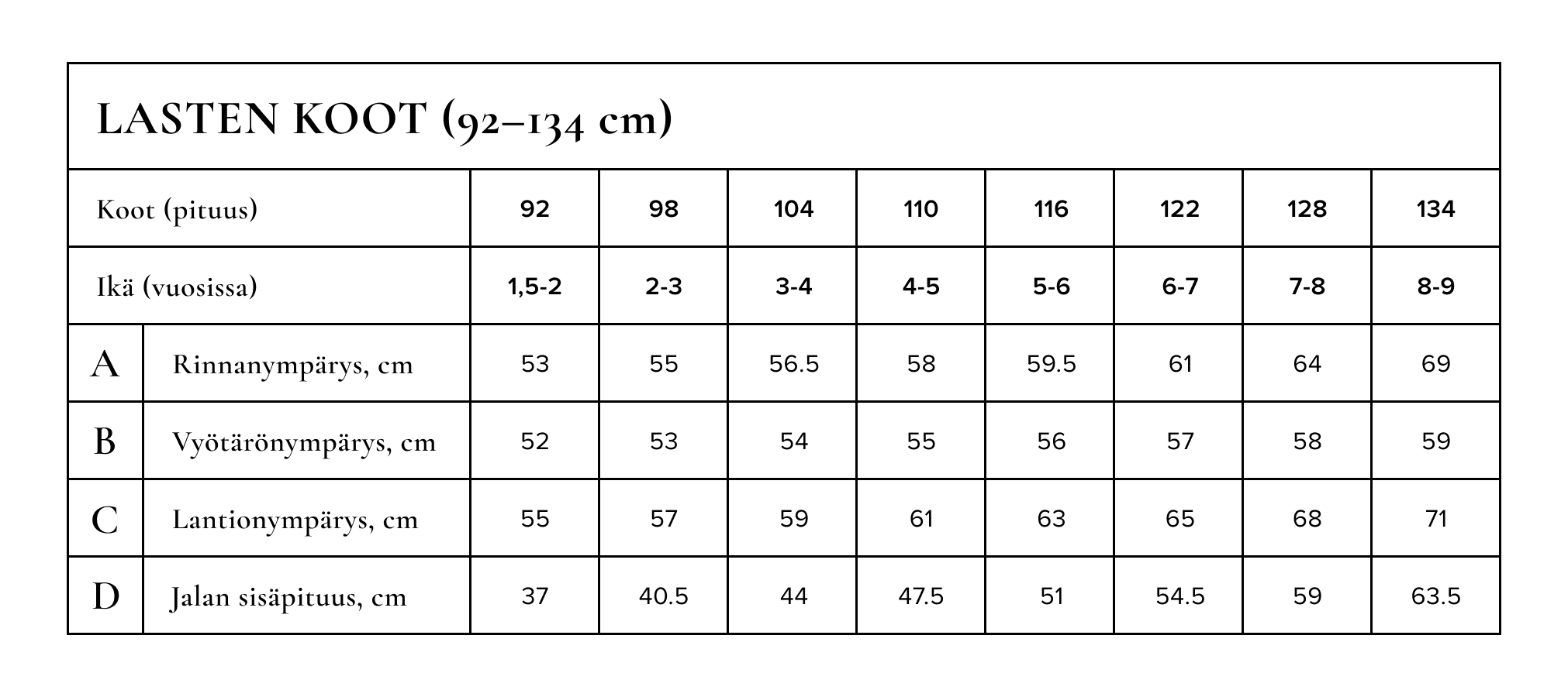 Kokotaulukoiden mitat ovat vartalon mittoja, eivät valmiin vaatteen mittoja. Mittaa siis lapsi tai itsesi – ei vaatetta. Lastenvaatteissa pituus on tärkein mitta. Jos lapsi on 104 cm pitkä, 104 cm koko on sopiva, 110 cm on hieman reilu. Jokaisen vartalon mittasuhteet ovat yksilölliset, ja mitat auttavat löytämään parhaiten istuvan koon. Valmiin vaatteen mitat ovat noin +1/-1 cm mittataulukon mitoista.
